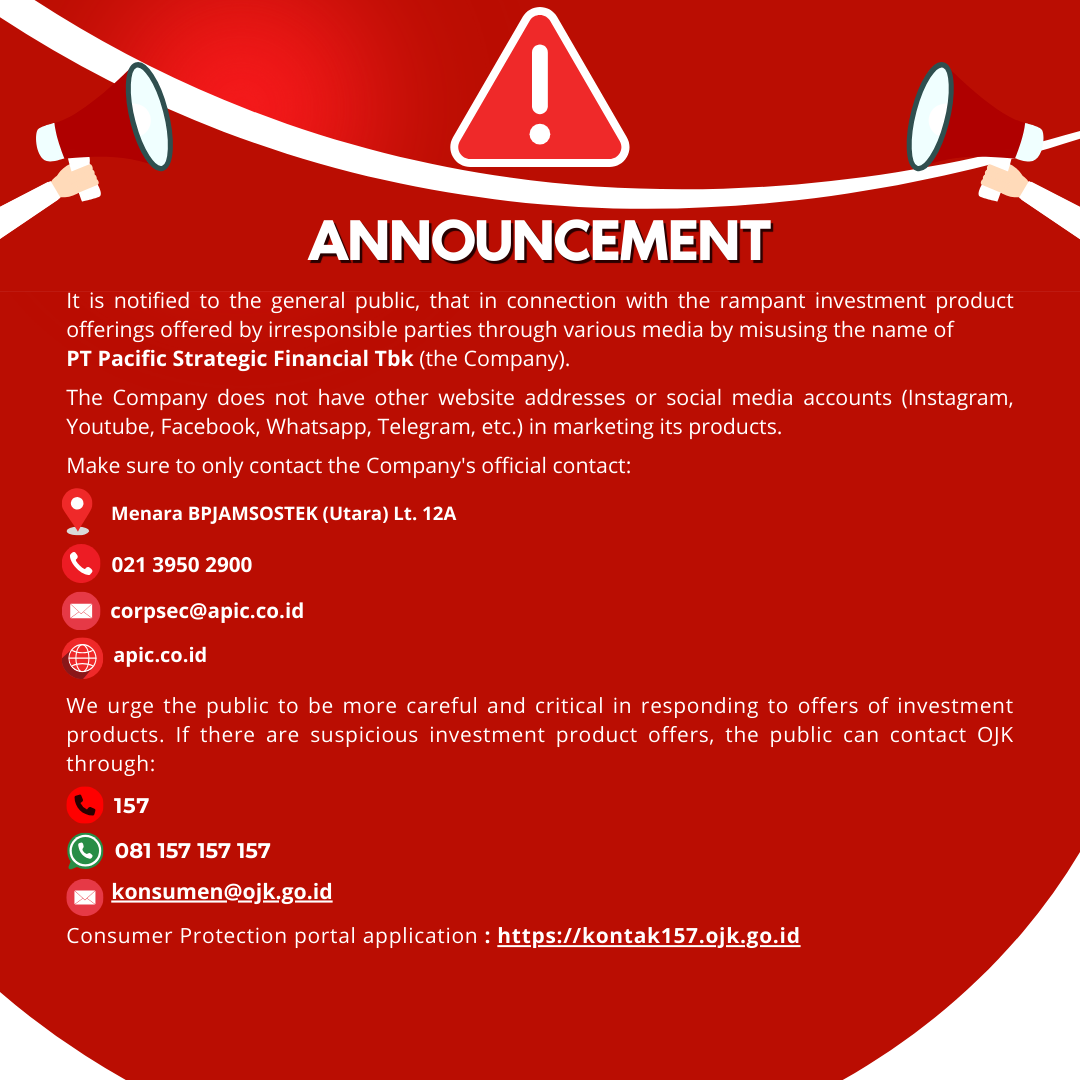 PT. Pacific Strategic Financial Tbk (the “Company”) is a company engaged in Investment and Other Management Consulting Activities that is active in the Indonesian Capital Market. The Company operates through 4 (four) Subsidiaries: PT Pacific Capital Investment, PT Pacific Sekuritas Indonesia, PT Pacific Multi Finance, and PT Pacific Strategic Invesco (through PT Pacific Life Insurance). The Company strives to remain consistent and become a leading investment company in the Indonesian Capital Market.